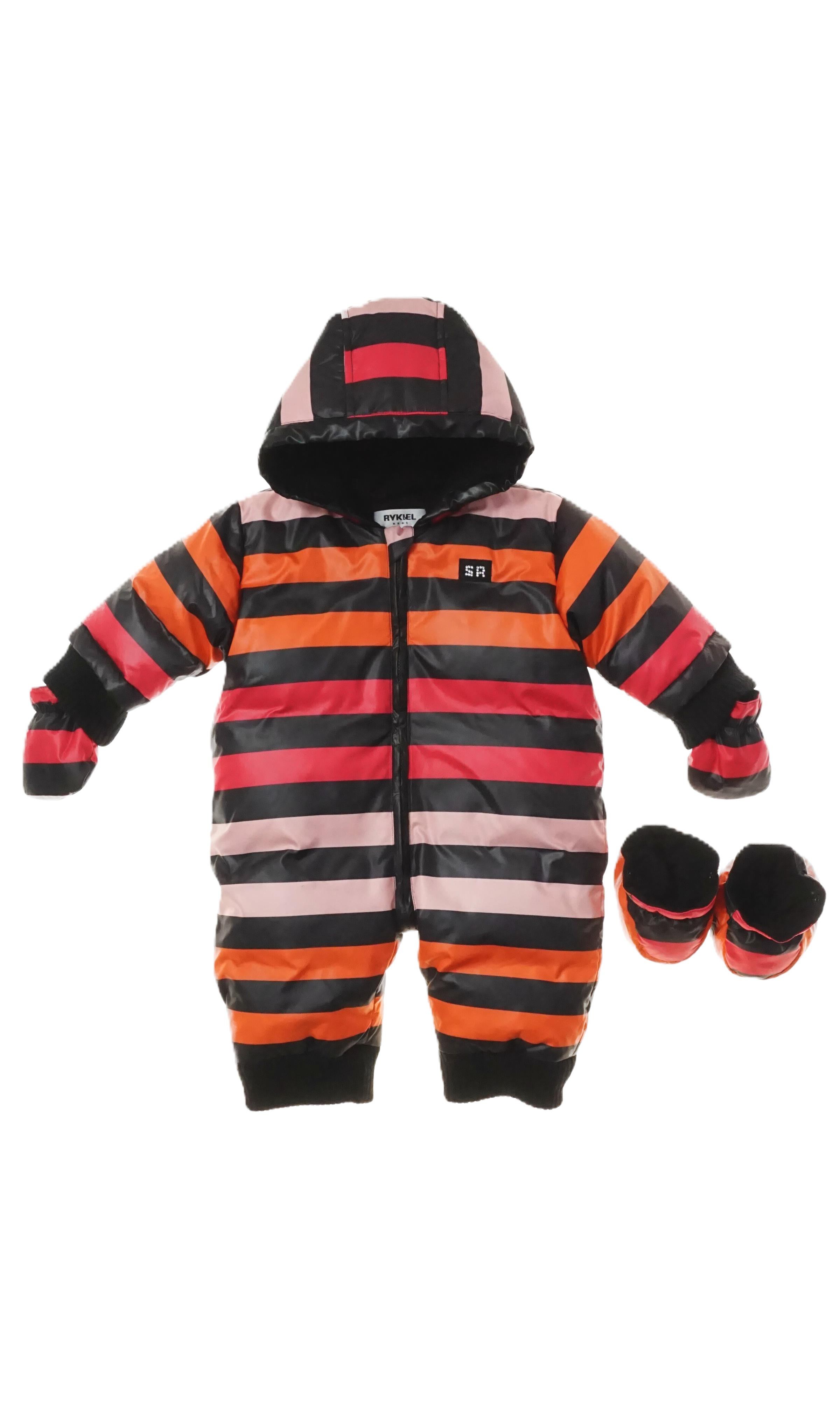 Sonia Rykiel Baby Jumpsuit, warmth, style, and comfort all in one. This unique jumpsuit combines French elegance with the highest functionality. It features vibrant, rich colors – pink, orange, and black arranged in distinctive horizontal stripes, giving it a unique, joyful character. The outer material is made of high-quality synthetic fabric – soft to the touch, durable, and waterproof, providing excellent protection against cold, wind, and moisture. The interior is lined with a pleasant, velvet-like lining with short, soft fur, providing exceptional comfort and warmth for your baby. Insulated with natural down, the jumpsuit is very lightweight. The set includes insulated gloves, booties and a hood, which is also insulated with down and protects the baby's head from the cold.