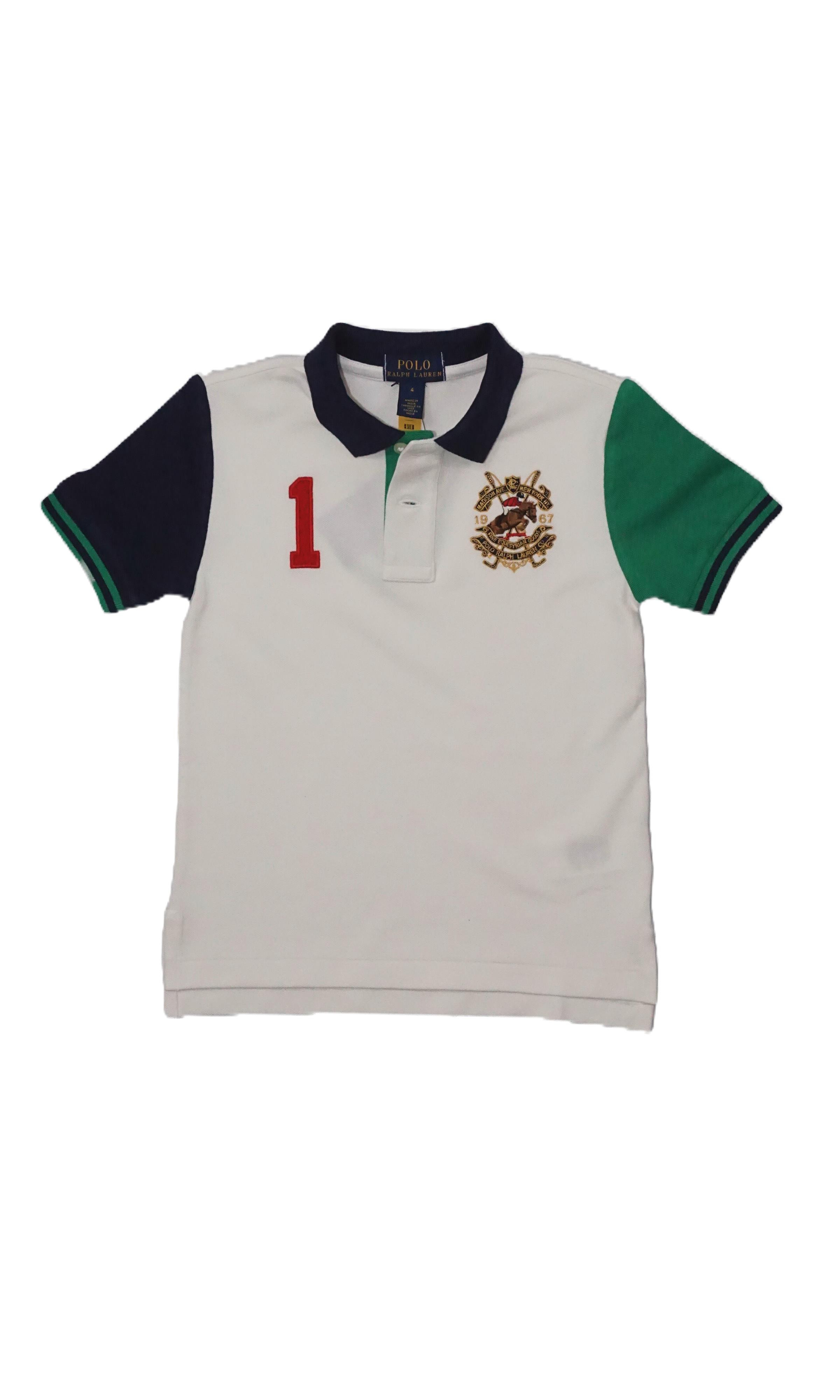 Boys' white polo shirt with a large crest on the side, Polo Ralph Lauren, cotton soft to the touch, pleasant to the skin, highly wash-resistant. Classic straight model, colorful sleeves and collar.