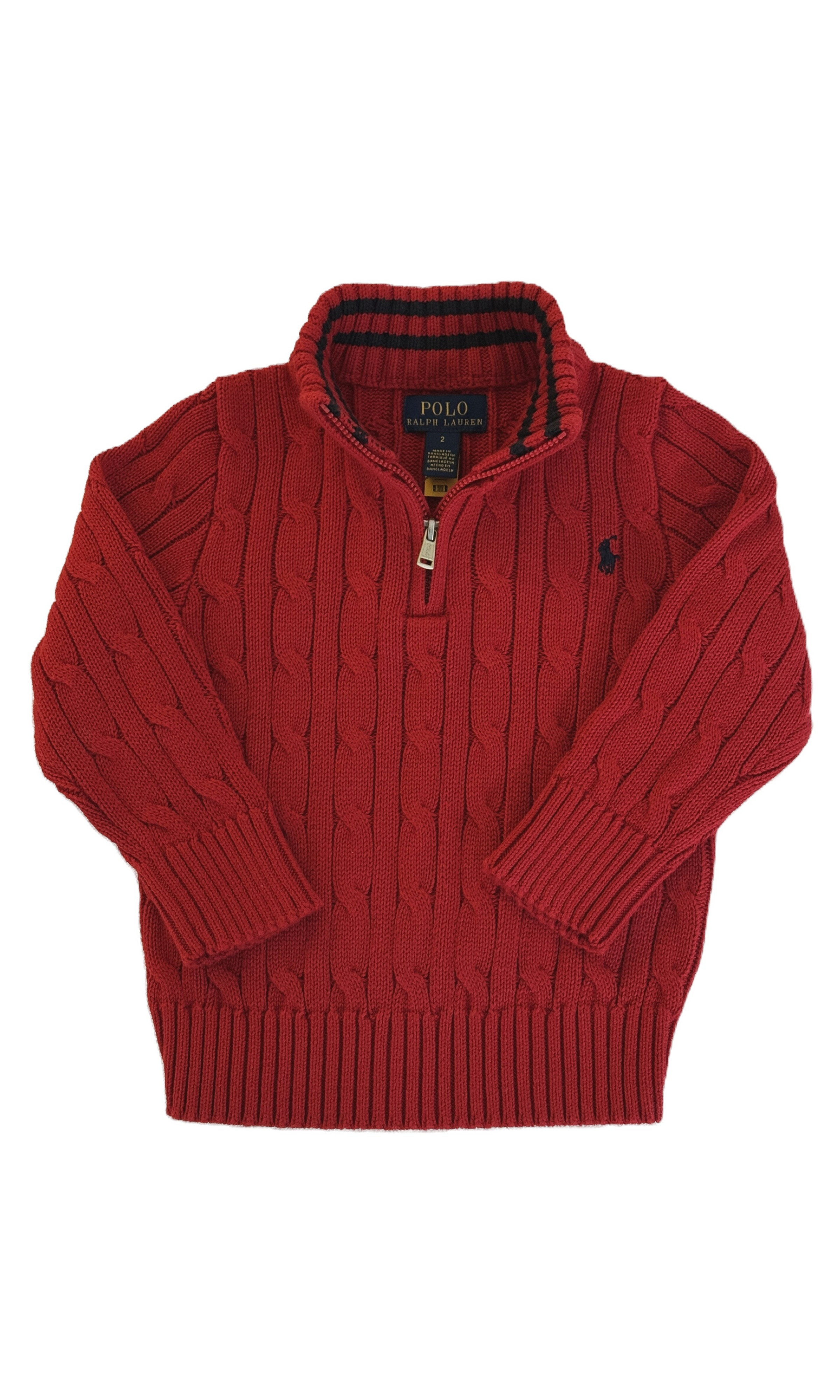 Red cable-knit sweater by Polo Ralph Lauren. Cotton is very soft and pleasant to the touch, quite thick. Does not pill or stretch. The sweater is decorated with a distinctive detail - a logo depicting a polo player on a horse. Double-ribbed stand-up collar at the neck, and zipper closure at the neck.