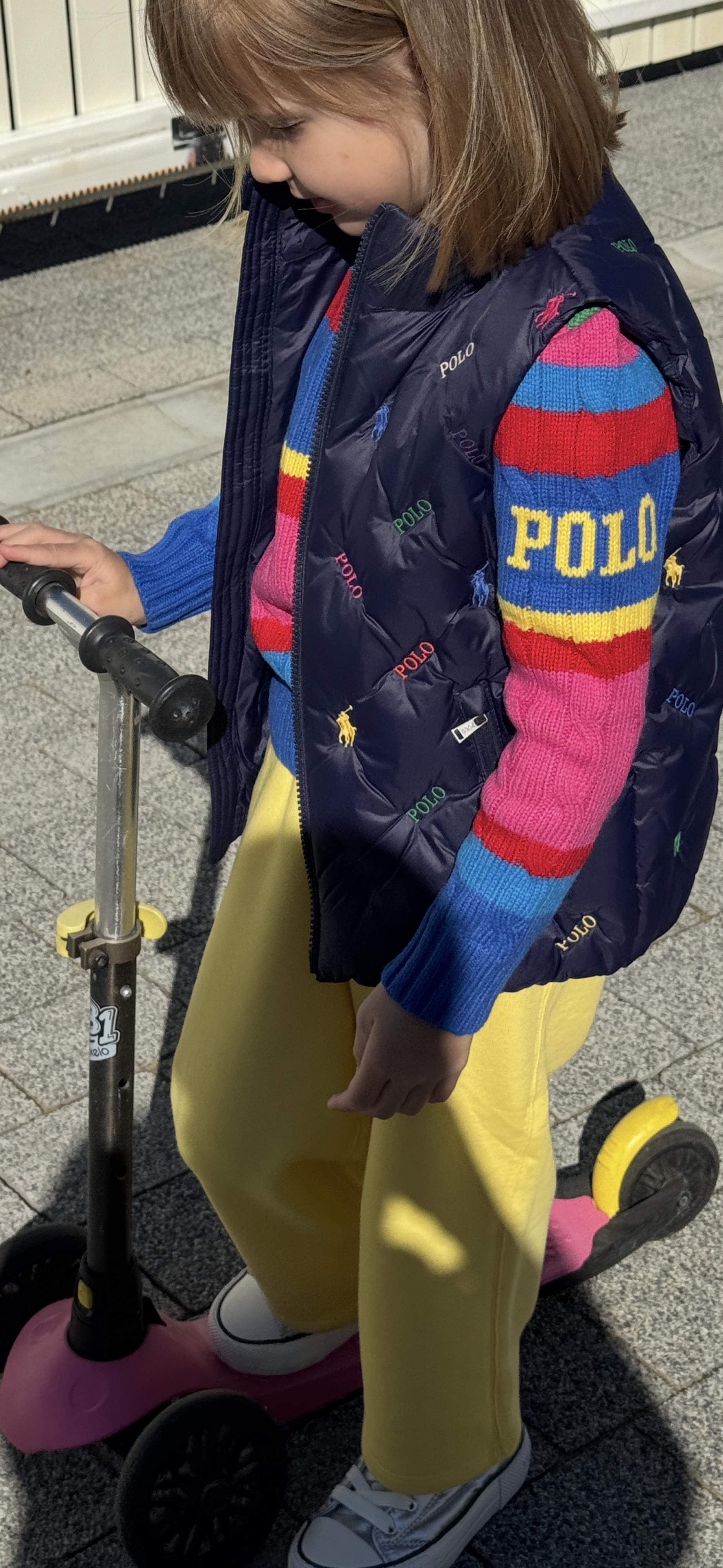 Colourful pullover Polo Ralph Lauren made of thick wool, the front and back of the sweater with contrasting coloured stripes, the sweater is bold, dynamic, bright. Thick, warm and pleasant to the touch, fastened with buttons on the shoulder up to the size of 6X.