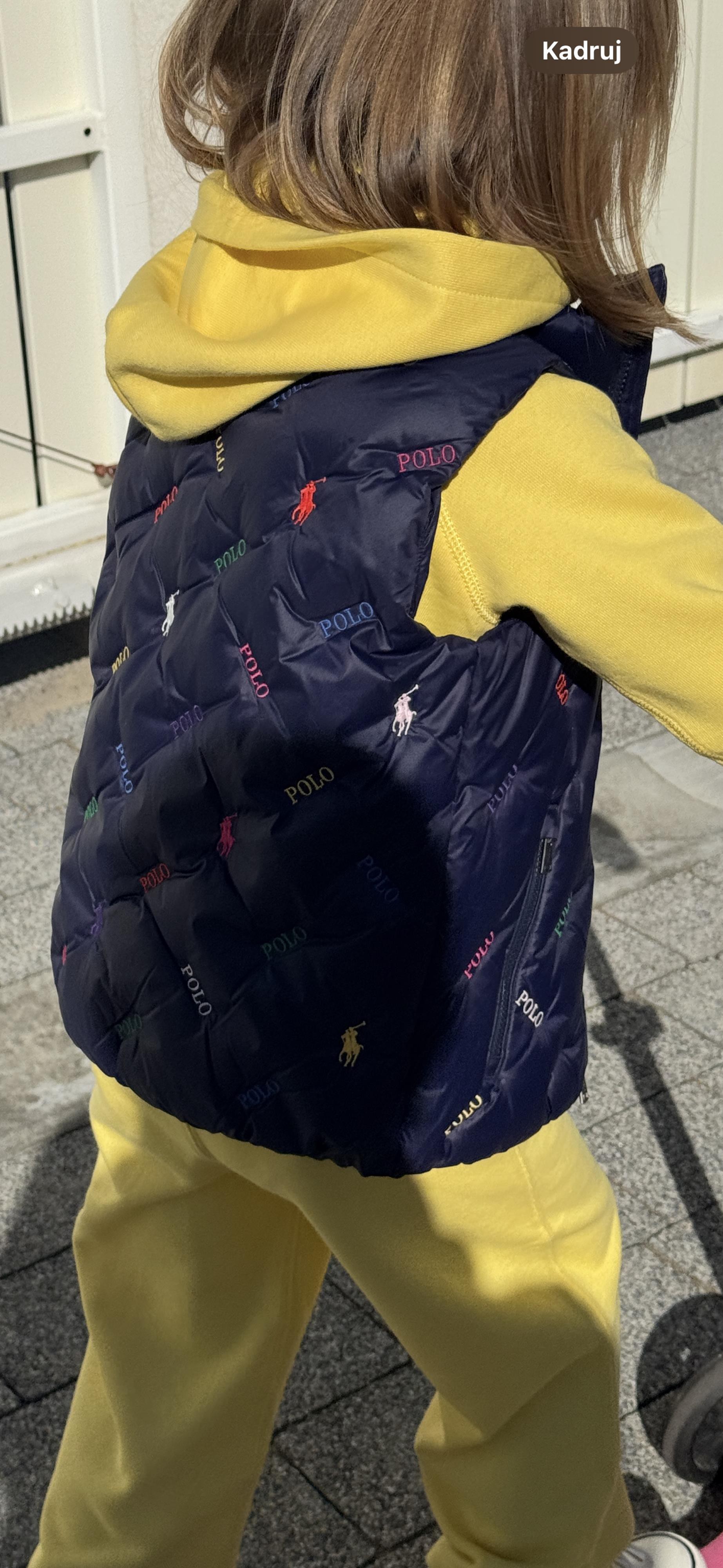 Navy blue sleeveless jacket in colourful polo print and polo player logo on horseback, which forms distinctive diagonal squares. Front pockets with zips. Sleeveless lightly insulated with synthetic down. Outer material very soft and pleasant to the touch. Very lightweight.