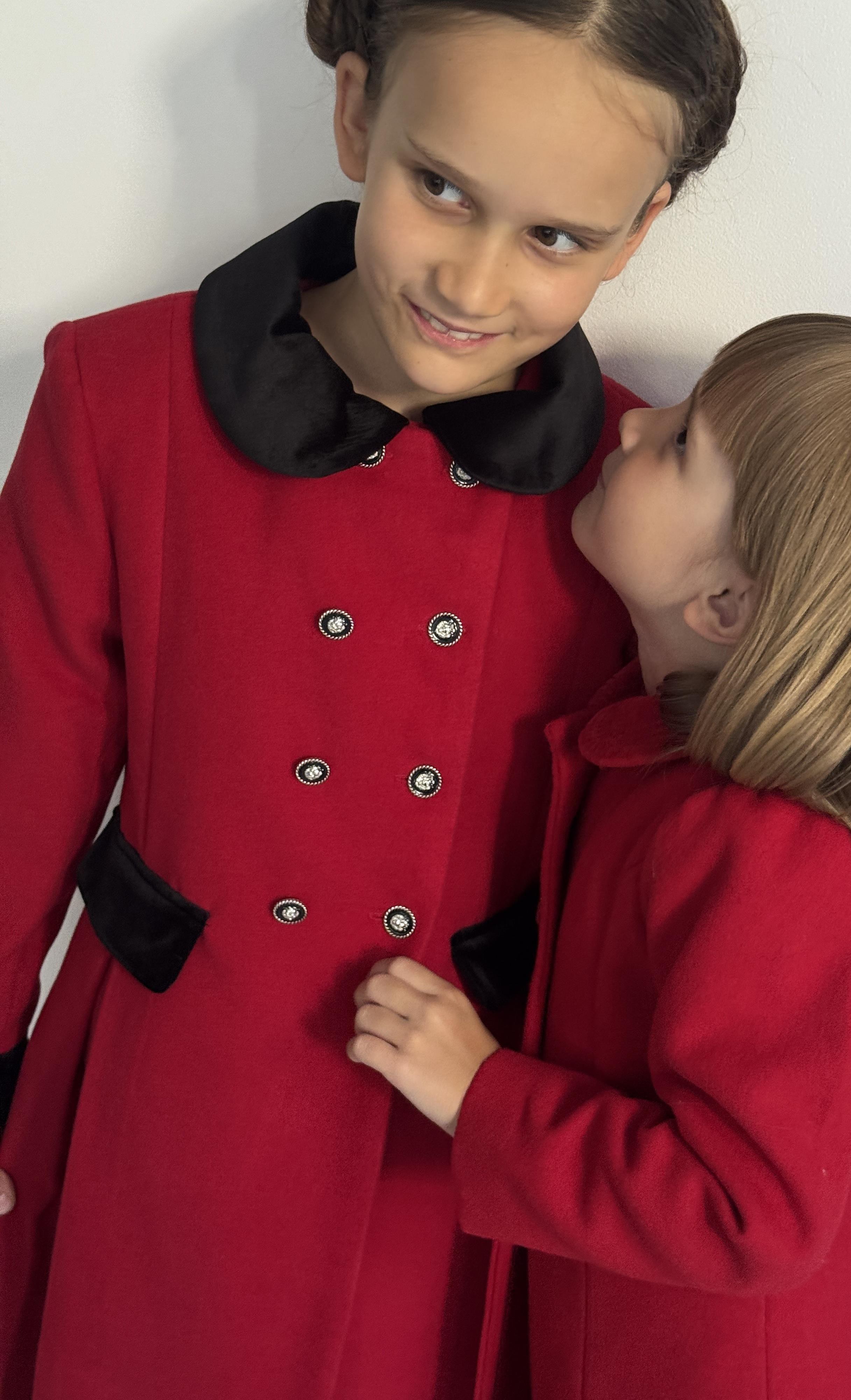 Red Patachou girls' coat, fastened with buttons at the front. There are pleats on the sides from the waist at the front, slightly flared at the back, a pleat in the middle and a decorative tab with two buttons. A very elegant coat, only with a thin lining.